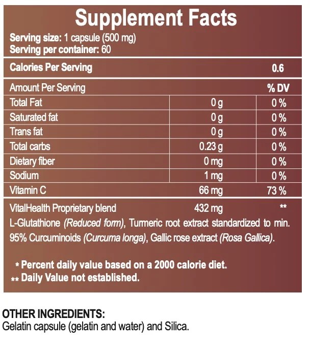 Vitamina C, Glutatión, Extracto de raíz de cúrcuma, Extracto de rosa mosqueta, Sílice.